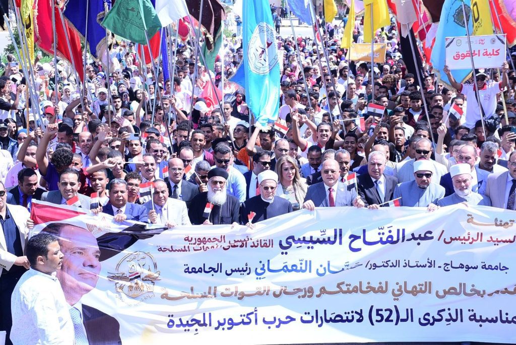 قاد الدكتور حسان النعماني رئيس جامعة سوهاج مسيرة ضخمه، وذلك في إطار احتفال الجامعة بانتصارات حرب أكتوبر المجيد ٥٢ ، يصاحبه فضيلة الشيخ الدكتور شوقي علام مفتي الديار المصرية السابق، واللواء بهجت فريد الخبير الإستراتيجي ومدير كلية الدفاع سابقاََد والدكتور محمد عبد المالك نائب رئيس جامعة الأزهر، القمص كيرلس فهيم وكيل مطرانية سوهاج والمنشاه والمراغة نائباً عن الأنب باخوم، والفنانة الإعلامية لقاء سويدان، ونواب رئيس الجامعة وعمداء الكليات، وعدد من أعضاء هيئة التدريس والإداريين