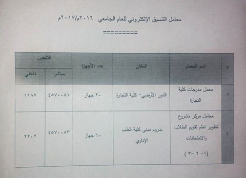 خصصت جامعة سوهاج 8 معامل للتنسيق الإلكتروني لتسجيل رغبات طلاب الثانوية العامة للعام الجامعي 2017/2016 ، وضمت معامل نظم تقويم الامتحانات وعددها 3 معامل ويوجد بها 60 جهاز، إضافة إلى 3 معامل فى كلية الطب البشرى، ومعامل مدرجات كلية التجارة وعددها 20 جهاز، ويبدأ العمل بها غداً من الساعة 9 صباحا وحتى الـ3 عصرا .