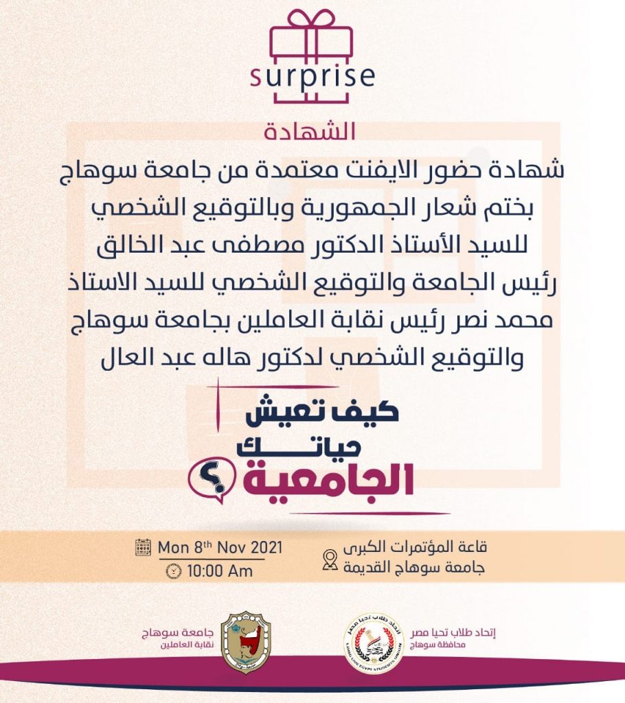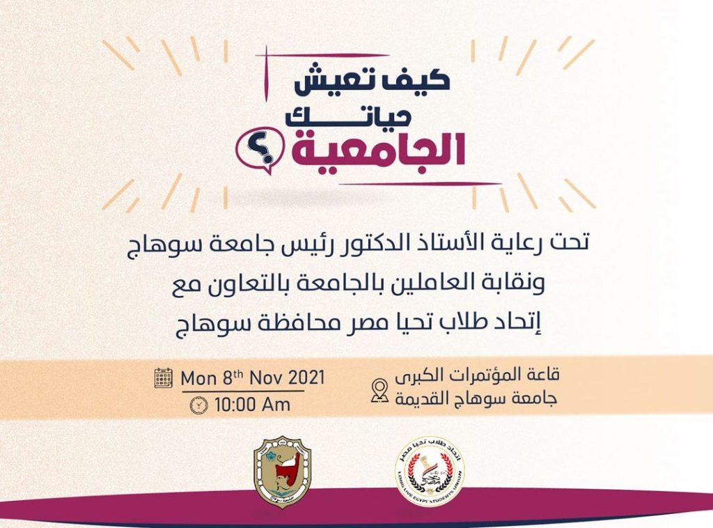 تعلن نقابة العاملين بجامعة سوهاج تحت رعاية الاستاذ الدكتور مصطفي عبد الخالق رئيس الجامعة عن ندوة بعنوان ” كيف تعيش حياتك الجامعية ” تحت إدارة و تنظيم اتحاد طلاب تحيا مصر و ذلك يوم الاثنين القادم باذن الله الموافق ٨ نوفمبر 2021م بقاعة المؤتمرات الكبرى بمقر جامعة سوهاج القديمة .