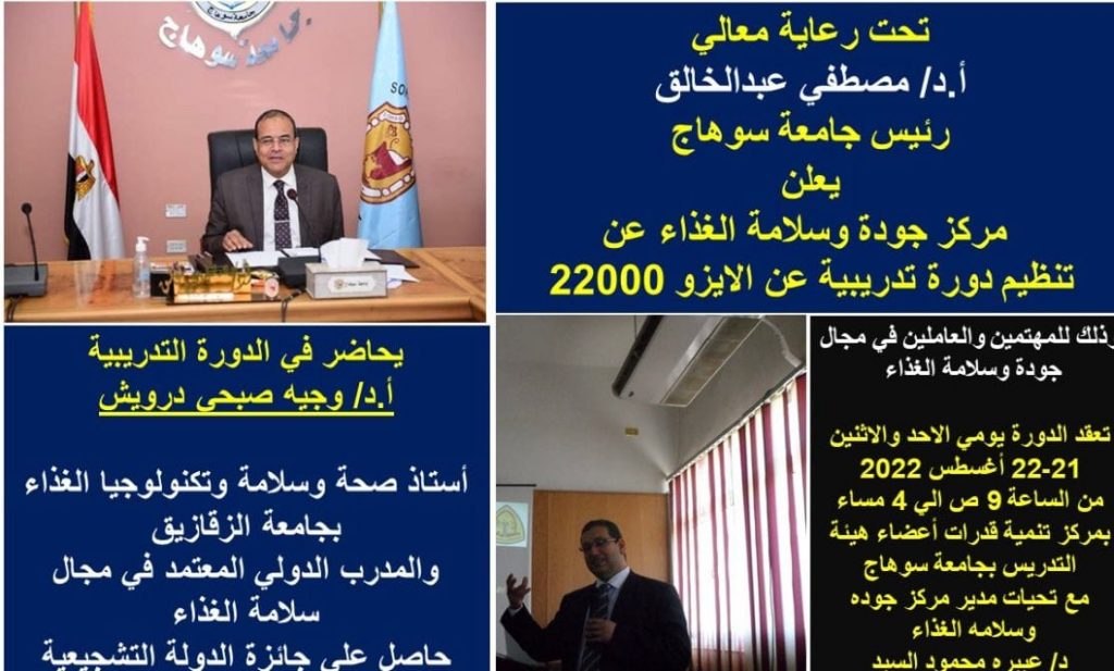 يعلن مركز جودة وسلامة الغذاء بجامعة سوهاج، عن فتح باب التسجيل للدورة التدريبية” الايزو 22000″والتي تستهدف كلاً من طلاب كليات الطب البيطري، والزراعة، والصيدلة، والعلوم، والتربية النوعيه وكل الكليات التي لها مجال فى التعامل مع الأغذية، والخريجين.