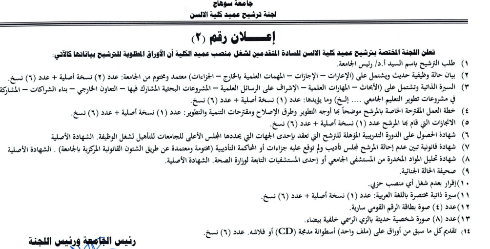 اعلان رقم (2) ترشيح عميد كلية الصيدلة وعميد كلية السن الاوراق المطلوبة الخاصة بترشيح عميد كلية الصيدلة وعميد كلية السن اعلان رقم 2 ترشيح عميدتنزيل