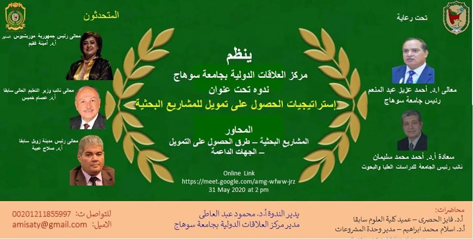 ينظم مركز العلاقات الدولية بجامعة سوهاج ندوه تحت عنوان إستراتيجيات الحصول على تمويل للمشاريع البحثية، وذلك يوم الاحد القادم الموافق 31 مايو 2020 الساعة الثانية ظهرا عبر تقنية الفيديو كونفرانس، صرح بذلك الدكتور أحمد عزيز عبد المنعم رئيس الجامعة.