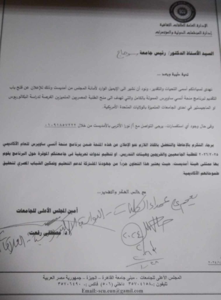 الاعلان عن فتح باب التقديم لبرنامج منحة انسي ساويرس للتنمية الاجتماعية وبالتعاون مع هيئة أميديست، وذلك للحصول على درجة البكالوريوس من الجامعات المرموقة في الولايات المتحدة في مجالات الاقتصاد، العلوم السياسية، الهندسة، التمويل، والإدارة مثل: هارفارد، ستانفورد، شيكاغو؛ وبنسلفانيا.