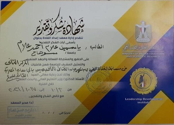 حصلت جامعة سوهاج على المركز الثاني خلال مشاركتها فى فعاليات المهرجان الغنائي للمتخصصين بالجامعات المصرية – برنامج القائد المبدع، الذى نظمه معهد إعداد القادة التابع لوزارة التعليم العالي، تحت شعار “احتفالات أكتوبر والجمهورية الجديدة”، بمشاركة ١٩٠ طالب متخصص فى التربية الموسيقية يمثلون ١٦ جامعة مصرية، صرح بذلك الدكتور مصطفي عبد الخالق القائم بعمل رئيس الجامعة، وقال أن الطالبة ياسمين علام بكلية التربية النوعية، فازت بالمركز الثاني فى مسابقات الغناء الفردي على مستوى الجامعات.