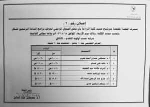 تتشرف اللجنة المختصة بترشيح عميد كلية الزراعة بأن تعلن الجدول الزمني لعرض برامج السادة المرشحين لشغل منصب عميد الكلية ، وذلك يوم الأربعاء الموافق 2022/5/18م بقاعة مجلس الجامعة مرتبة حسب أولوية التقدم ، كالتالي :