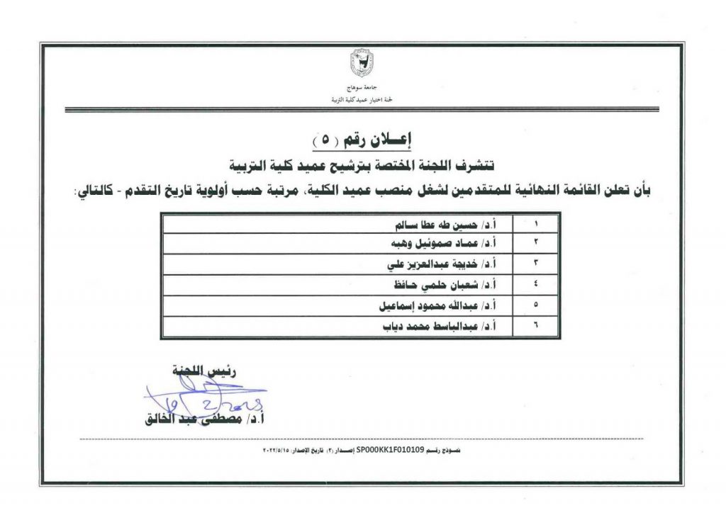 أعلنت اللجنة المختصة بترشيح عميد كلية التربية القائمة النهائية للمتقدمين لشغل منصب عميد الكلية وذلك حسب أولوية تاريخ التقدم وهم