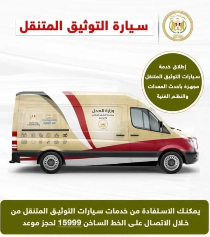 والجدير بالذكر ان وزارة العدل وفرت هذه السيارة التى تعمل بنظام الشباك الواحد لتقدم كافة خدمات التوثيق ( عدا اثبات التاريخ ) بالمنازل والشركات، عن طريق نظام الحجز المسبق على الرقم الموحد 15999 في موعد أقصاه 48 ساعه، كما يتم الدفع بهذه السياره لدعم مكاتب التوثيق التى بها ازدحام لتخفيف التكدس فيها، مع ضرورة توفير وسيلة دفع الكترونية (فيزا – كارت مرتب – كارت ميزه ) لاتمام المعامله واستلامها مختومة فى نفس الوقت حيث تعتبر هذه السيارة فرع توثيق متنقل كامل .