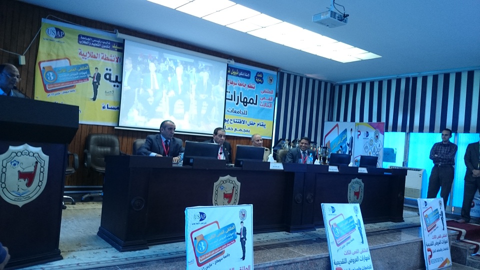 انطلقت منذ قليل فاعليات ختام الملتقى القمي الثالث لمهارات العروض التقديمية، و الذي تنظمه جامعة سوهاج فى الفترة من 28 – 30 مارس الجاري، بحضور د. نبيل نور الدين رئيس الجامعة، و د انيس شيحة نائب رئيس الجامعة للدراسات العليا والبحوث، و د محروس محمود محروس مستشار الانشطة الطلابية و عميد كلية التربية الرياضية، ود. بهاء مزيد عميد كلية الالسن, و عدد من السادة عمداء الكليات و اعضاء هيئة التدريس و رؤساء وفود الجامعات المشاركة .