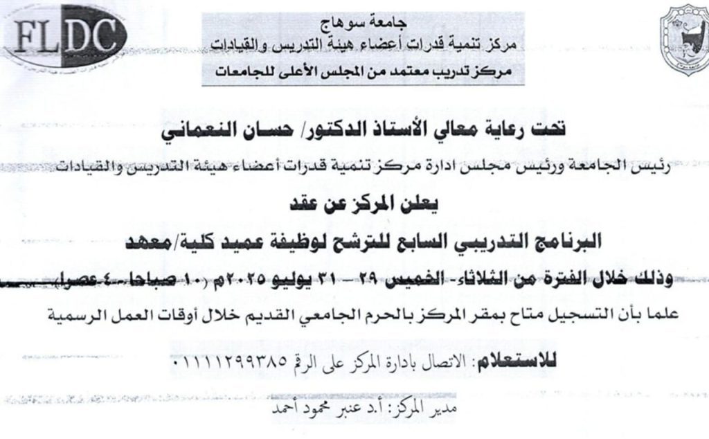 جامعة سوهاج تعلن عن بدء البرنامج التدريبي السابع للترشح لوظيفه عميد كلية/ معهد بمركز تنمية قدرات أعضاء هيئة التدريس في الفترة من ٢٩ الي ٣١ يوليو ٢٠٢٥ من الساعه ١٠ صباحا وحتي ٤ عصرا بمقر مركز تنمية القدرات بالحرم الجامعي القديم