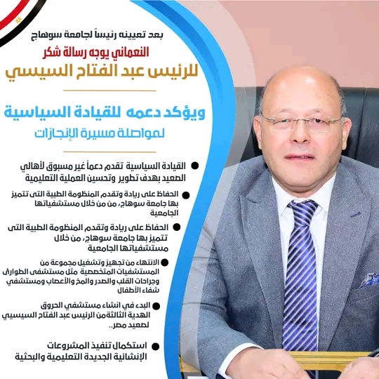 وجه الدكتور حسان النعماني رئيس جامعة سوهاج، شكرًا خاصًا للرئيس عبدالفتاح السيسي رئيس الجمهوربة لثقته الكبيرة بتعيينه رئيساً للجامعة، وذلك، لاستكمال المسيرة ومواصلة العمل لتصبح الجامعة بين مصاف الجامعات العالمية.