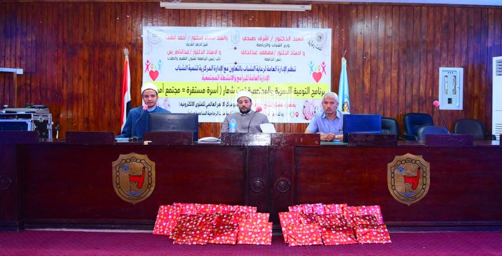 تواصل جامعة سوهاج سلسلة ندواتها التوعوية والتي تنظمه الإدارة العامة لرعاية الشباب (إدارة النشاط الثقافي والفني) ، بالتعاون مع الإدارة المركزية للبرامج والأنشطة الجامعية بوزارة الشباب والرياضة ومشيخة الأزهر الشريف، تحت شعار “أسرة مستقرة = مجتمع آمن”، وذلك بالقاعة الزجاجية بمقر الجامعة القديم.