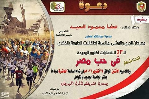 تنظم الإدارة العامة لرعاية الشباب المركزية بجامعة سوهاج يوم الاثنين الموافق 24 أكتوبر الجارى مهرجان ” المشي والجري ” تحت شعار «في حب مصر»، وذلك ضمن سلسلة احتفالات الجامعة بمرور 43 عامًا على انتصارات أكتوبر، صرح بذلك د. صفا محمود السيد القائم بأعمال رئيس الجامعة.