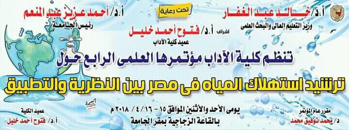 “تنظم كلية الآداب جامعة سوهاج المؤتمر العلمى الرابع بعنوان ” ترشيد استهلاك المياه في مصر بين النظرية والتطبيق