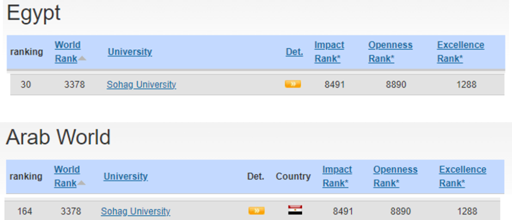 احتلت جامعة سوهاج مركزاً متقدماً أفريقياً في تنصيف ويبوميتركس للجامعات 2024، حيث حصلت جامعة سوهاج علي المركز 3378 عالمياً و 164 عربيا و 30 محلياً في هذا التنصيف.