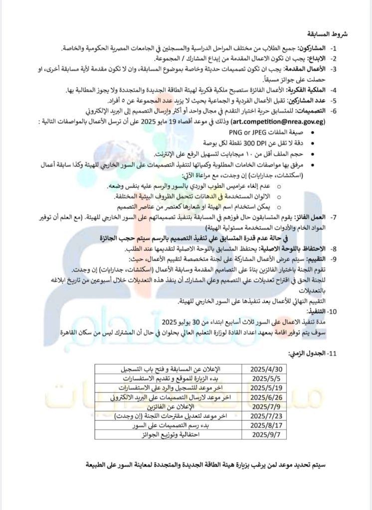 تعلن هيئة الطاقة الجديدة والمتجددة بالتعاون مع المجلس الأعلي للجامعات عن مسابقة فنية تحت عنوان “إبداع مستدام” في مجال اللوحات التعبيرية (الجداريات) علي السور الخارجي للهيئة في المجالات التالية: