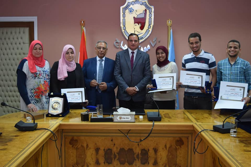 كرم اليوم الدكتور أحمد عزيز رئيس جامعة سوهاج الطلاب المتميزين أصحاب المبادرات المجتمعية والمشاريع الابتكارية الحاصلين على مراكز متقدمة علي مستوي الجمهورية، وذلك بحضور الدكتور محمود أبو العز مدير مركز الخدمات الاليكترونية، والمهندسة نهال المغربي.