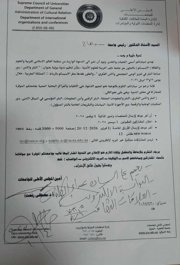 ” النشر و الأمن : دور صناعة النشر في تعزيز الوعي المجتمعي و الأمن الفكري ” و المقرر عقدها بمقر الايسيسكو بالرباط المملكه المغربية خلال يومي 22و23 أبريل 2026