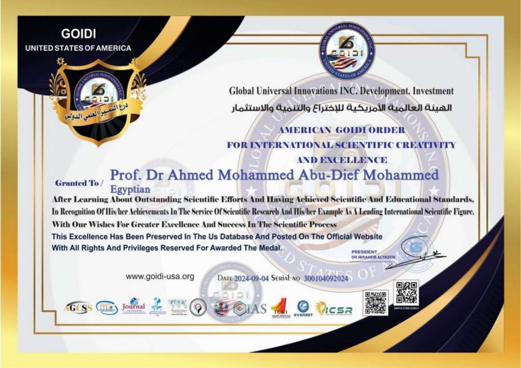 تهئنة لمنح أ.د/ أحمد محمد ابو ضيف درع التميز العلمي الدولي من الهيئة العالمية الأمريكية للاختراع والتنمية والاستثمار (USA GOIDI)