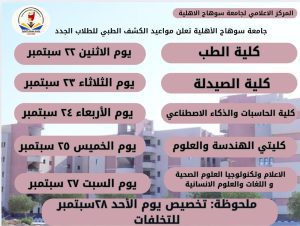 تعلن جامعة سوهاج الأهلية برئاسة الدكتور حسان النعماني رئيس الجامعة، عن مواعيد توقيع الكشف الطبي على الطلاب الجدد المقبولين بكلياتها للعام الجامعي 2025/2026، وذلك اعتبارًا من يوم الاثنين الموافق ٢٢ سبتمبر وحتي يوم السبت ٢٧ سبتمبر، وذلك بمقر الجامعة الاهلية بمدينة سوهاج الجديدة، وذلك في إطار استكمال إجراءات القبول والتحاق الطلاب بالكليات المختلفة.
