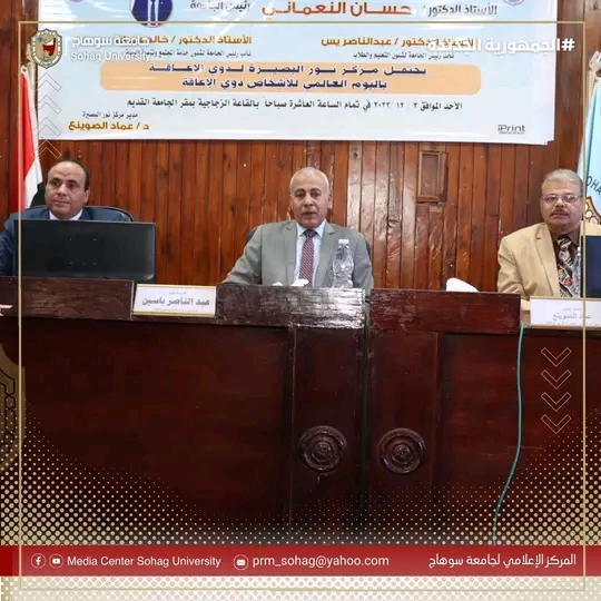 نظم مركز نور البصيرة لذوي الإعاقة بجامعة سوهاج، احتفالية اليوم العالمي لذوى الاعاقة، والذي يوافق ٣ ديسمبر من كل عام، بحضور كلاً من الدكتور عبد الناصر يس نائب رئيس الجامعة لشئون التعليم والطلاب، والدكتور خالد عمران نائب رئيس الجامعة لشئون خدمة المجتمع وتنمية البيئة ونائب رئيس مجلس إدارة المركز، والدكتور عماد الصوينع مدير المركز، والدكتورة سلمى عبد المنعم نائب مدير المركز، محمد الباز مدير مكتب التأهيل، والدكتور هشام السيد منسق الهلال الأحمر، ولفيف من أعضاء هيئة التدريس والطلاب بالجامعة.