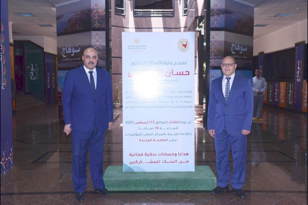 كرم الدكتور حسان النعماني رئيس جامعة سوهاج خريجي الجامعة الأوائل الذين تم تعيينهم فى البنك الزراعي المصري وعددهم ٢٢ من كليتى التجارة والحقوق، وذلك على هامش فعاليات ندوة “الشباب والشمول المالي”، والتى نظمتها الإدارة العامة لرعاية الشباب المركزية بالتعاون مع البنك، في إطار الاحتفال باليوم العالمي للشباب، بحضور المحاسب محمد احمد فرغلي رئيس قطاع البنك الزراعي، وعدد من العمداء ووكلاء الكليات، بالمركز الدولي للمؤتمرات بالحرم الجامعي الجديد.