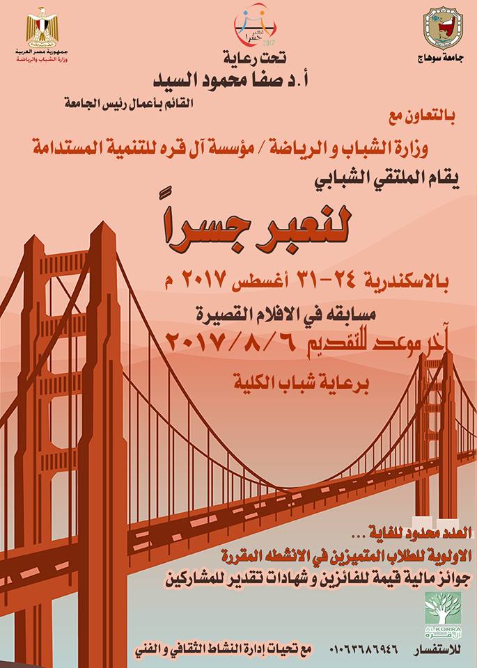 تشارك جامعة سوهاج  في الملتقي الشبابي الذي تنظمه وزارة الشباب والرياضة بالتعاون مع مؤسسة آل قرة للتنمية المستدامة  بعنوان ” لنعبر جسراً ” في الفترة من 24-31 أغسطس الجاري بالمدينة الشبابية بأبى قير بالاسكندرية، صرح بذلك د.صفا محمود السيد القائم بأعمال رئيس الجامعة .