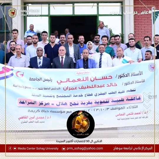 تواصل جامعة سوهاج تنفيذ قوافلها الطبية المجانية لتقديم الخدمات الصحية والعلاجية، للمواطنين بقري و مراكز المحافظة الأكثر احتياجاً، حيث إنطلقت القافلة إلى قرية نجع هلال بمدينة المراغة، وتم خلالها فحص وعلاج ٦٠٢مواطن.