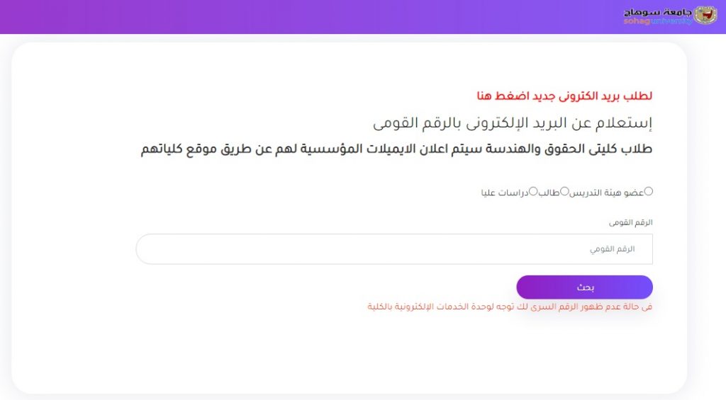 أطلقت وحدة نظم المعلومات الإدارية بجامعة سوهاج بوابة الاستعلام عن الايميلات المؤسسية لمنتسبي الجامعة، بالرقم القومي على الموقع الالكتروني التالي :