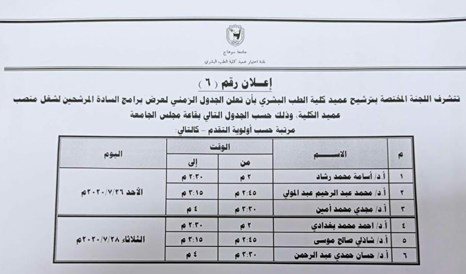 جامعة سوهاج تعلن الجدول الزمني لبرامج المرشحين علي منصب عميد كلية الطب البشري