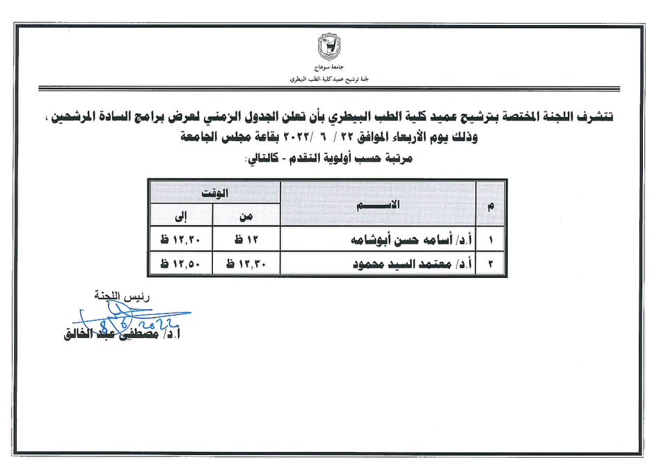 تتشرف اللجنة المختصة بترشيح عميد كلية الطب البيطري بأن تعلن الجدول الزمني لعرض برامج السادة المرشحين ، وذلك يوم الأربعاء الموافق 2022/6/22م بقاعة مجلس الجامعة مرتبة حسب أولوية التقدم – كالتالي :