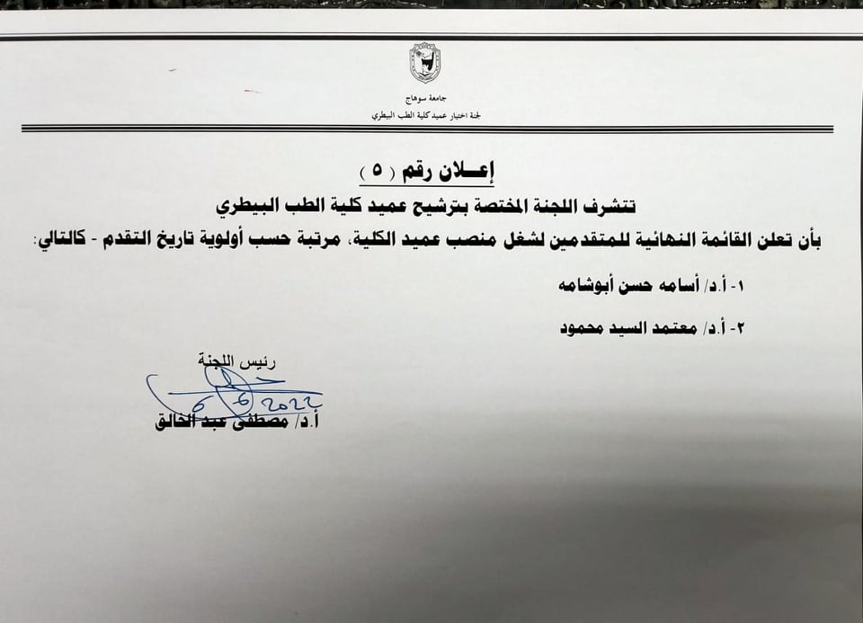 تتشرف اللجنة المختصة بأن تعلن القائمة النهائية للمتقدمين لشغل منصب عميد كلية الطب البيطري ، مرتبة حسب أولوية تاريخ التقدم كالتالي :