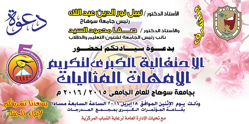 تنظم جامعة سوهاج، غداً الاثنين، احتفالية كبرى لتكريم الامهات المثاليات للعام الجامعي 2015 – 2016 بقاعة المؤتمرات الكبري، صرح بذلك د. نبيل نور الدين رئيس الجامعة وقال ان الحفل يعد تكريمًا للنماذج المُشرفة للأمهات المثاليات في المجتمع وعرفانًا بدورهم القيادي في جعل أبنائهم نماذج يحتذى بهم، مؤكداً أنه مهما بلغ حجم التكريم والإشادة فإننا لم ولن نوفِ حق الام في التكريم الذي يليق بها وبدورها في المجتمع .