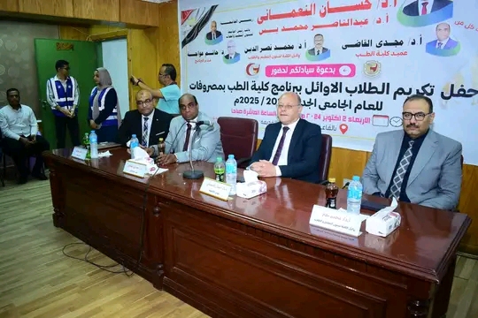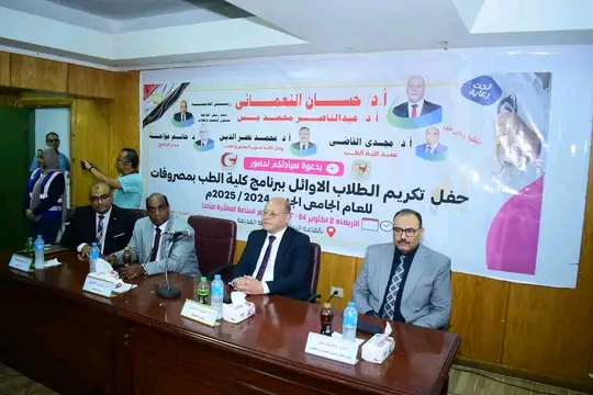 كرم الدكتور حسان النعماني رئيس جامعة سوهاج أوائل الفرق الدراسية ببرنامج كلية الطب البشري بمصروفات بنظام النقاط المعتمدة للعام الجامعى ٢٠٢٤م – ٢٠٢٥م شمل التكريم عدد ٢٠ طالب من الفرقة الأولي والثآنية بالبرنامج، وذلك بحضور الدكتور مجدي القاضي عميد كلية الطب البشري، والدكتور محمد نصر الدين، والدكتور احمد فتحي النحاس وكلاء الكلية والدكتور خالد عبد العال مدير عام المستشفيات الجامعية، والدكتور حاتم عواجه مدير البرنامج، وعدد من رؤساء الأقسام وأعضاء هيئة التدريس والطلاب وأولياء الأمور، وذلك بقاعة الدكتور محمود رياض بالمستشفى الجامعي القديم.