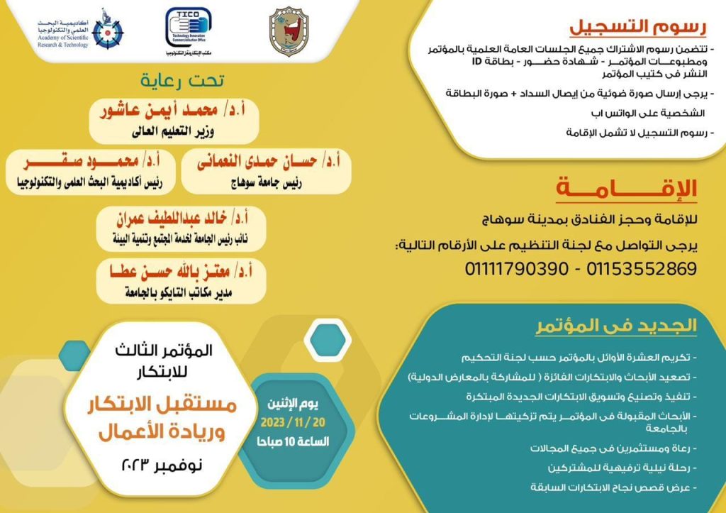 تنظم جامعة سوهاج اليوم الإثنين مؤتمر “مستقبل الابتكار وريادة الأعمال في نسخته الثالثة”، وذلك تحت رعاية الدكتور محمد أيمن عاشور وزير التعليم العالي، والدكتور حسان النعماني رئيس الجامعة، والدكتور محمود صقر رئيس أكاديمية البحث العلمي والتكنولوجيا، وذلك في تمام الساعة العاشرة صباحاً بقاعة قناة السويس بالحرم الجامعي الجديد.