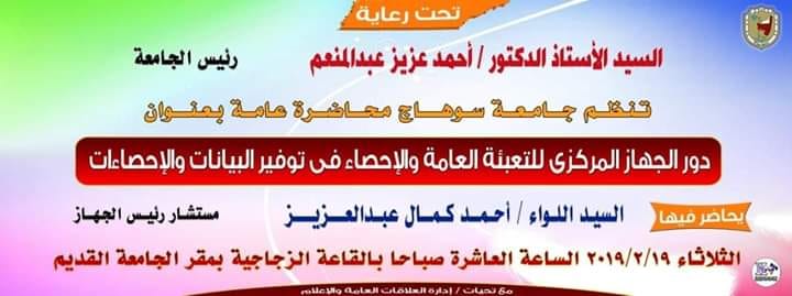 تنظم جامعة سوهاج الثلاثاء الموافق 19 من فبراير الجاري، محاضرة عامة عن “دور الجهاز المركزي للتعبئة العامة والإحصاء في توفير البيانات والإحصائيات”، ويحاضر بها اللواء أحمد كمال عبد العزيز مستشار رئيس الجهاز المركزي، صرح بذلك الدكتور أحمد عزيز رئيس الجامعة، وقال أن المحاضرة ستتناول عدة محاور من أهمها رؤية ومهام الجهاز، الخدمات التي يقدمها للمواطنين، منظومة العمل الإحصائي، بالإضافة إلى التعريف بدور الجهاز في بناء وتنمية قدرات العاملين، أهم الإحصاءات والمؤشرات الرسمية والبيانات والتقارير والإصدارات المتعددة له.