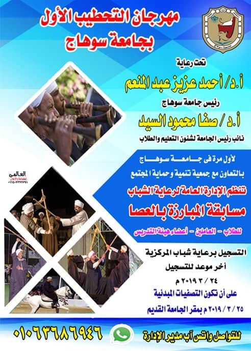 تنظم الإدارة العامة لرعاية الشباب بجامعة سوهاج بالتعاون مع جمعية تنمية وحماية المجتمع « مهرجان التحطيب الأول » للطلاب وأعضاء هيئة التدريس والعاملين بالجامعة، علي ان يكون أخر موعد للتسجيل يوم الاحد الموافق 24 مارس الجاري، بينما تعقد التصفيات المبدئية يوم الاثنين 25 مارس بمقر الجامعة القديم.