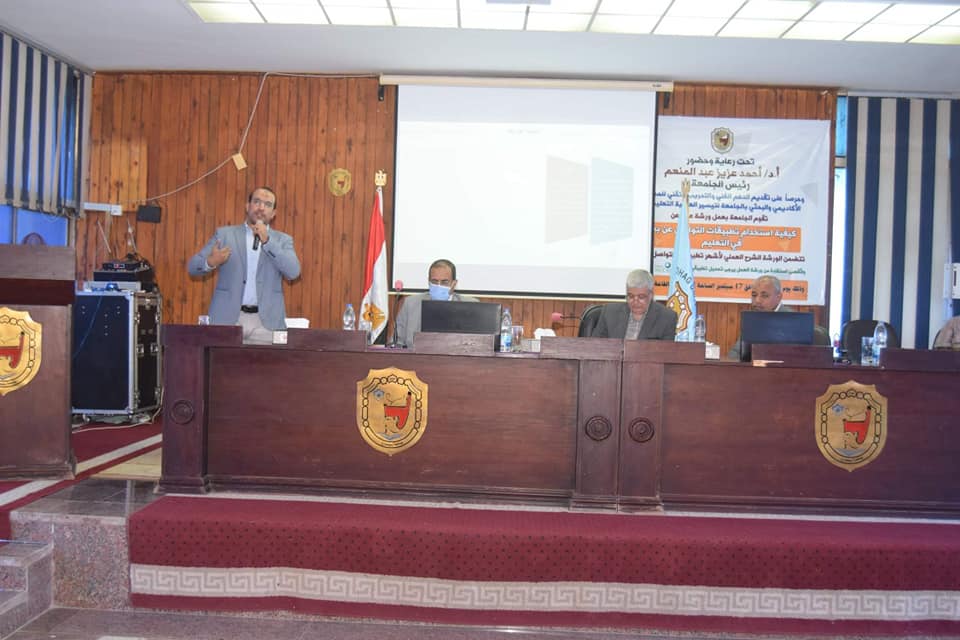 ومن جانبه قال الدكتور مصطفى عبدالخالق أن ورشة العمل تقام تحت رعاية الدكتور احمد عزيز رئيس الجامعة وتهدف إلى تفعيل نظام التعليم عن بُعد ورفع كفاءة أعضاء هيئة التدريس وجميع منتسبي الجامعة، تماشياً مع النظم التعليمية السائدة في العالم عقب انتشار جائحة كرونا “كوفيد 19” وأضاف أن المجلس الأعلى للجامعات أطلق نظام التعليم عن بعد “التعليم الهجين” والذي وضع قواعده المجلس الأعلى للجامعات ويتيح للطلاب بالتواجد ثلاثة أيام للكليات العملية ويومين للكليات النظرية وباقي الأيام دارسة عن بُعد.