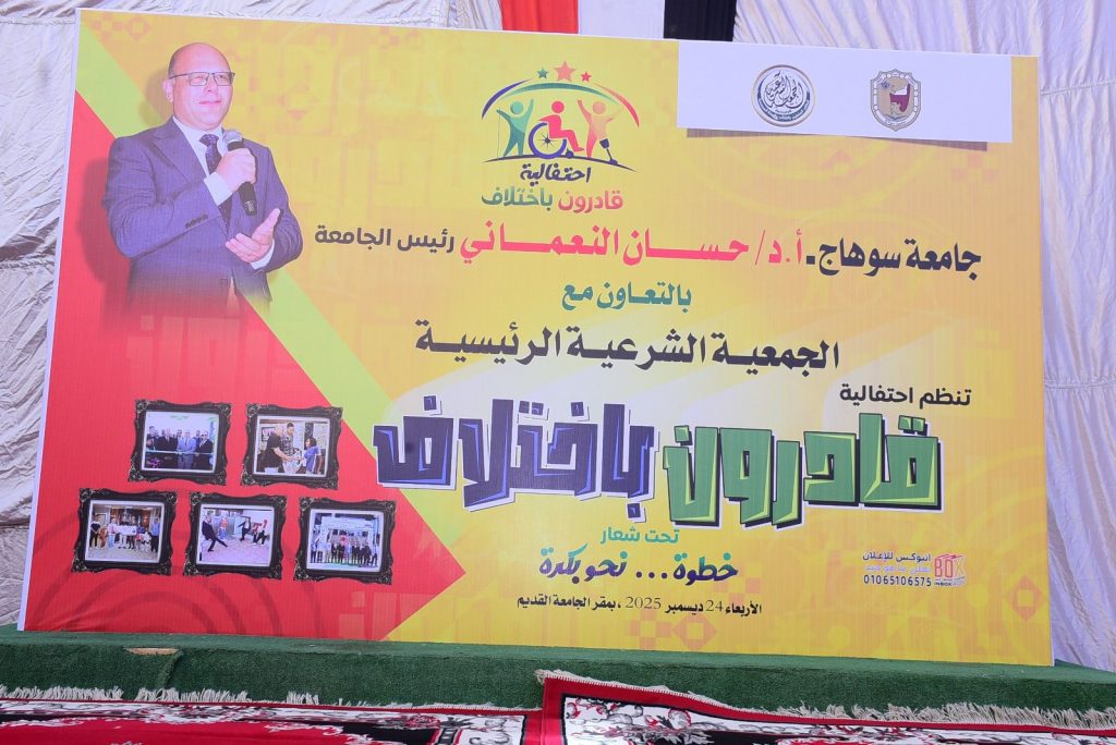 في احتفالية ضحمة نظمتها جامعة سوهاج بالتعاون مع الجمعية الشرعية الرئيسية بالقاهرة سلم الدكتور حسان النعماني، رئيس الجامعة، والدكتور مصطفى إسماعيل، الأمين العام للجمعية، أجهزة تعويضية ومساعدات الطبية، للطلاب قادرون باختلاف بالجامعة.