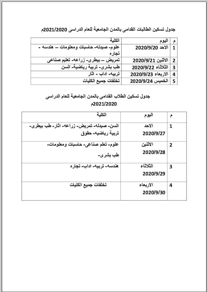 أعلنت إدارة المدن الجامعية بجامعة سوهاج جدول تسكين الطلاب و الطالبات القدامى بالمدن الجامعية للعام الدراسي 2021/2020، علي أن يبدأ تسكين الطالبات القدامي في الفترة من 20- 24 سبتمبر الجاري، أما تسكين الطلاب القدامي في الفترة من 27-30 سبتمبر الجاري، وذلك وفقًا للجدول التالي :