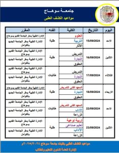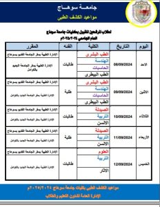 أعلنت جامعة سوهاج، عن بدء توقيع الكشف الطبي على الطلاب والطالبات الجدد المرشحين للإلتحاق بالفرق الأولى بمختلف كليات الجامعة عن العام الجامعي الجديد 2025/2024 .حيث تم إعلان الجدول الخاص بالأيام المحددة لطلاب كل كلية، وذلك لإجراء الكشف الطبي لهم بالإدارة الطبية بالمقرين القديم والجديد للجامعة.