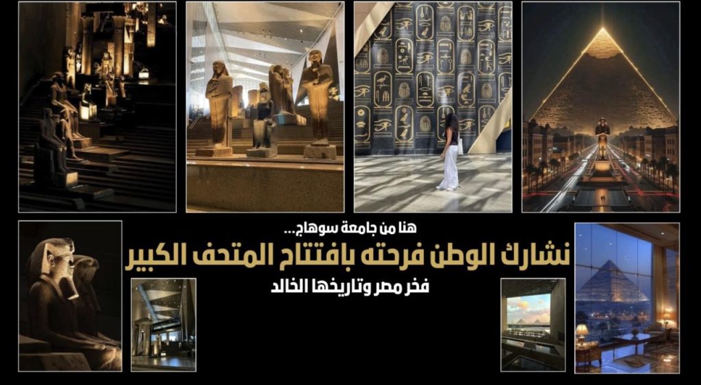 هنا من جامعه سوهاج نشارك الوطن فرحته بافتتاح المتحف المصري الكبير اليوم الساعه ٦ مساء بث مباشر لفعاليات الافتتاح من قاعه المؤتمرات الكبري بالحرم الجامعي القديم ..الدعوه عامه
