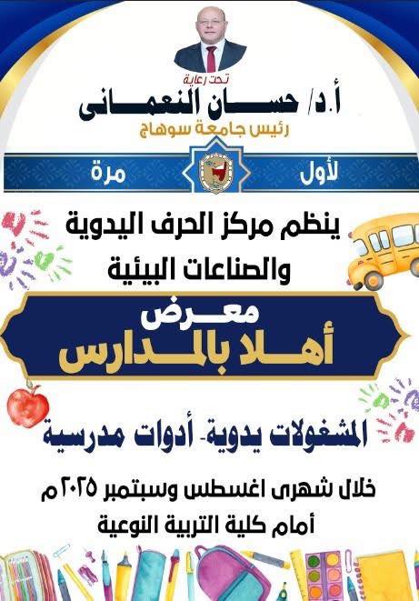 ينظم مركز الحرف اليدويه و الصناعات البيئية بجامعة سوهاج معرض اهلا بالمدارس فى الفترة من 17/8/2025الى 20/9/2025 فى مقر الجامعة القديم يشمل المعرض كافة مستلزمات المدارس بأسعار مخفضة لمنسوبي الجامعة