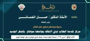 يتشرف الدكتور حسان النعماني رئيس الجامعة بدعوه سيادتكم غدا لحضور افتتاح مركز خدمة الطلاب ذوي الإعاقة بجامعة سوهاج ، وذلك في تمام الساعه العاشره صباحاً بالمركز الدولي للمؤتمرات بالمقر الجديد.