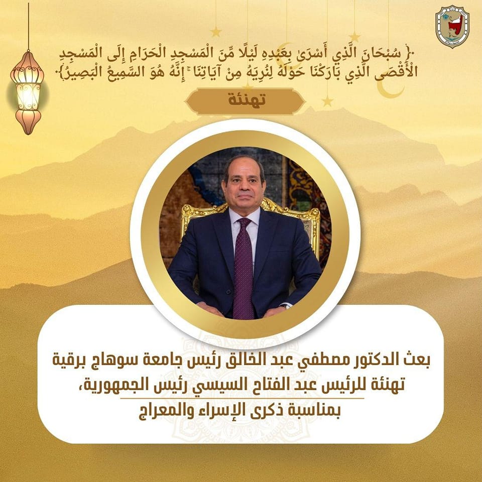 “يطيب لي أن أتقدم بإسمي وبإسم منسوبي جامعة سوهاج بخالص التهانى القلبية لفخامتكم في ذكرى الإسراء والمعراج، هذه الذكرى العطرة التي جسدت منارة في تاريخ الرسالة الإسلامية العظيمة، تلك الرحلة المباركة التي جاءت لنستلهم منها معانى وقيم الإثابة وحسن الجزاء، ولنتخذها دافعًا لنا على البذل والعطاء لرفعة وطننا في تلك المرحلة التى نستهدف فيها التنمية والبناء، ونحن إذ نحتفى بتلك الذكرى العطرة لنبتهل إليه جل في علاه أن يُعيد هذه الأيام الطيبة علي مصرنا الغالية والأمة العربية والإسلامية في آمان ورفعة وازدهار، و أن نحقق لهذا البلد العزيز كل مقومات الدولة العصرية امناً واستقراراً في ظل قيادتها الحكيمة، داعمين ومؤازرين لها لتتخطى مصرنا الغالية كافة المحن نحو التقدم والتنمية”