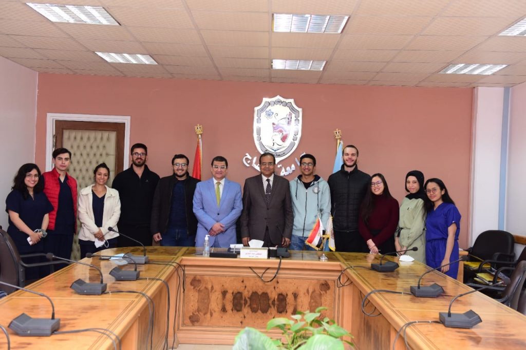 عقد الدكتور مصطفى عبدالخالق رئيس جامعة سوهاج، لقاء مع الوفد الطلابي المكون من ٩ طلاب، والقادم من دول البرازيل والمكسيك وإندونسيا، وذلك في إطار برنامج التبادل الطلابي الخاص بالاتحاد الفدرالي العالمي لطلبة كلية الطب، والمتمثل في الجمعية العلمية الطلابية ( SMSA) بالكلية، وذلك بقاعة مجلس الجامعة بالحرم القديم، بحضور الدكتور أسامة رشاد القائم بعمل عميد الكلية، والطالب عبدالرحمن الجعفري سكرتير عام الجمعية، والطالب مينا مجدي أمين الصندوق والمسئول عن برنامج التبادل الطلابي.