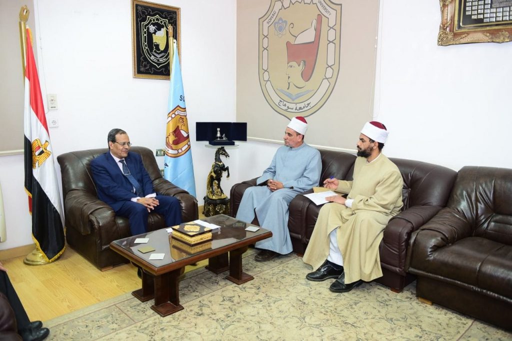 استقبل الدكتور مصطفى عبد الخالق رئيس جامعة سوهاج، اليوم لجنة من الأزهر الشريف، لبحث آليات تنفيذ عدد من الندوات التوعوية التثقيفية للطلاب في مختلف الكليات بالجامعة، حيث ضمت اللجنة كلاً من الشيخ محمود محمد الحويط مدير عام الوعظ والإرشاد ورئيس لجنة الفتوى بالمحافظة، والشيخ رجب وزيري مدير الدعوة والإعلام الديني وأمين لجنة الفتوى والوعظ، والشيخ محمد عبدالمحسن العزازي عضو لجنة الفتوى بالأزهر الشريف، وذلك بمكتب رئيس الجامعة بالحرم الجامعي القديم.