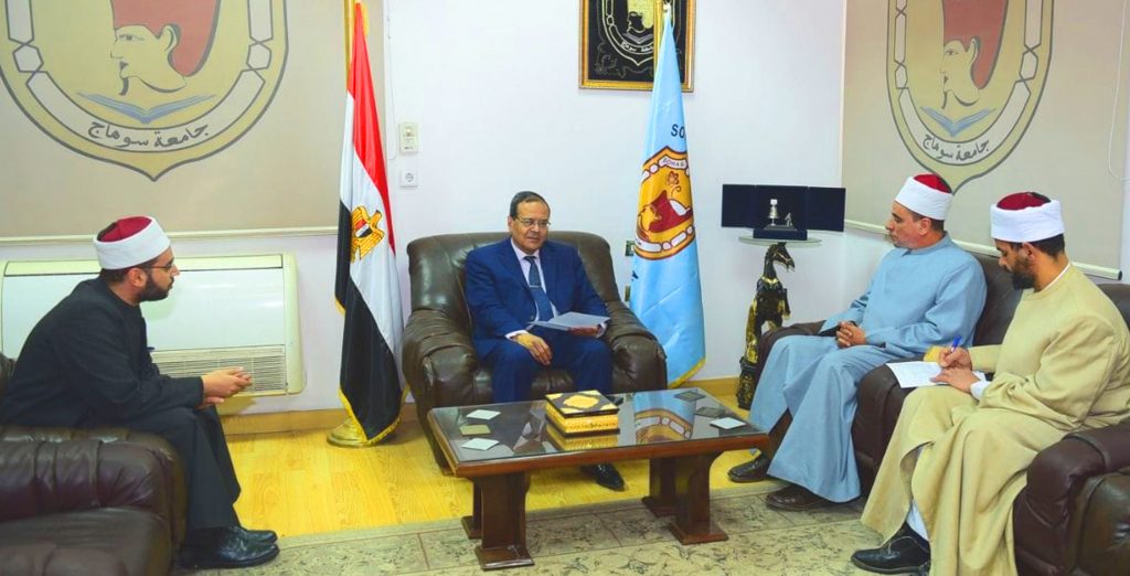 استقبل الدكتور مصطفى عبد الخالق رئيس جامعة سوهاج، اليوم لجنة من الأزهر الشريف، لبحث آليات تنفيذ عدد من الندوات التوعوية التثقيفية للطلاب في مختلف الكليات بالجامعة، حيث ضمت اللجنة كلاً من الشيخ محمود محمد الحويط مدير عام الوعظ والإرشاد ورئيس لجنة الفتوى بالمحافظة، والشيخ رجب وزيري مدير الدعوة والإعلام الديني وأمين لجنة الفتوى والوعظ، والشيخ محمد عبدالمحسن العزازي عضو لجنة الفتوى بالأزهر الشريف، وذلك بمكتب رئيس الجامعة بالحرم الجامعي القديم.