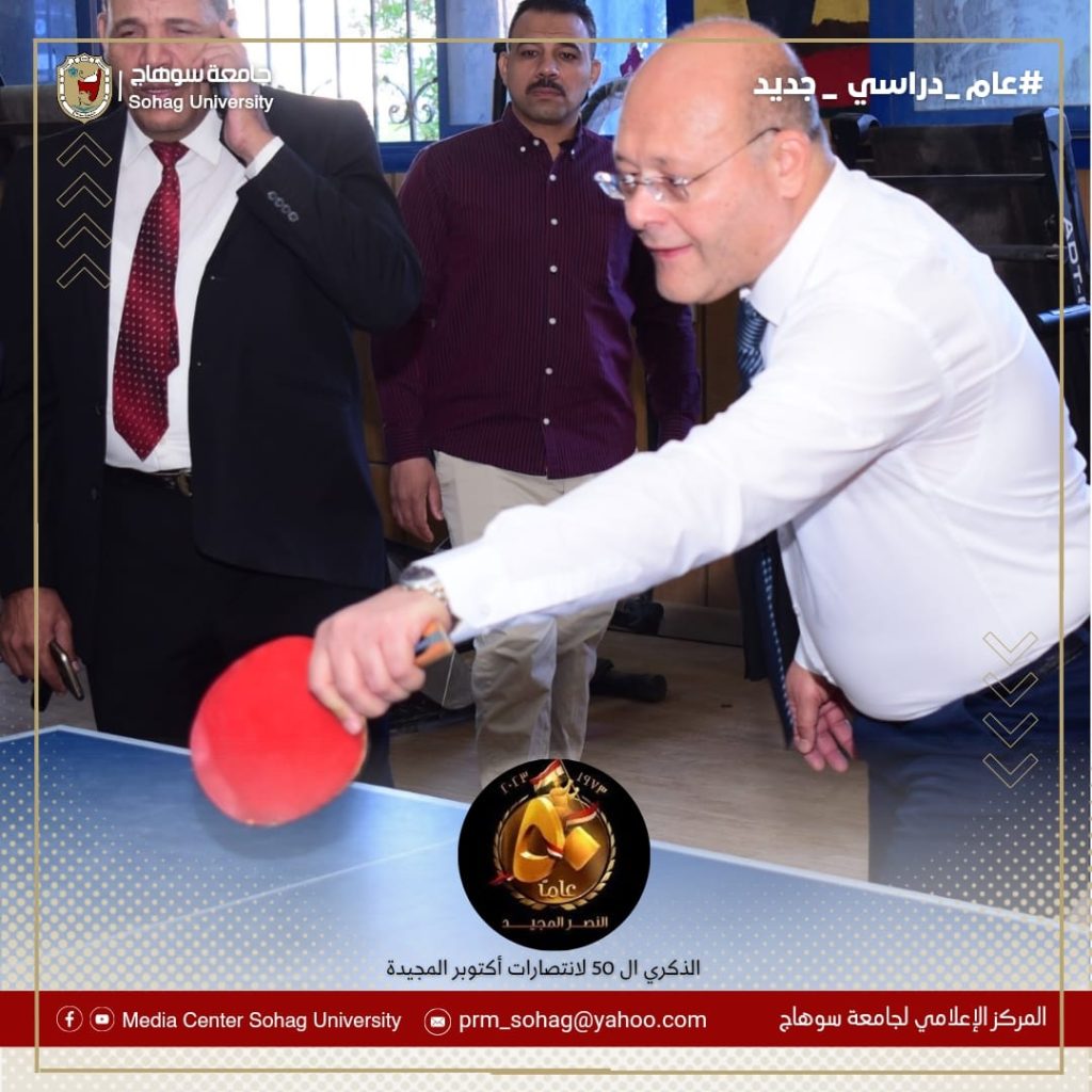 شارك الدكتور حسان النعماني رئيس جامعة سوهاج الطلاب بلعبة “البينج بونج” خلال تفقده صالة الالعاب الرياضية بكلية التربية، يصاحبه كلاً من الدكتور عبد الناصر يس والدكتور خالد عمران نواب رئيس الجامعة، وعدد من أعضاء هيئة التدريس والطلاب، وذلك بمقر الجامعة الجديدة.