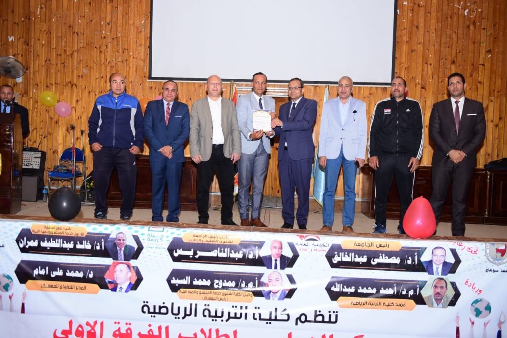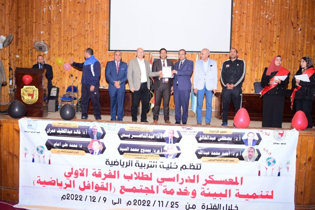 شهد الدكتور مصطفي عبد الخالق رئيس جامعة سوهاج ختام فعاليات معسكر القوافل الرياضية لخدمة المجتمع، والذي نظمه قطاعى شئون التعليم والطلاب، وخدمة المجتمع وتنمية البيئة بالكلية في الفترة من ٢٥ نوفمبر و حتى ٩ ديسمبر الجاري، بحضور الدكتور حسان النعماني والدكتور عبد الناصر يس والدكتور خالد عمران نواب رئيس الجامعة، اللواء محمد بكري طرخان مساعد أول وزير الداخلية الأسبق والرئيس الشرقى لرابطة أبناء سوهاج بالقاهرة والاعلامي حمادة عثمان امين الرابطة، والدكتور أحمد عبد الله القائم بعمل عميد الكلية، والدكتور ممدوح محمد السيد وكيل الكلية لخدمة المجتمع وتنمية البيئة ورئيس المعسكر، الدكتور محمد علي إمام المدير التنفيذي للمعسكر ونخبه من أعضاء هيئة التدريس وطلاب الكلية، وذلك بقاعة المؤتمرات الكبري بالحرم الجامعي القديم.