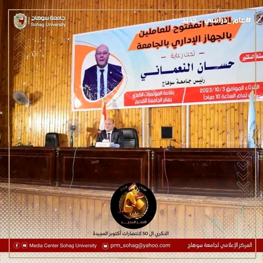 عقد الدكتور حسان النعماني رئيس جامعة سوهاج، لقاءََا موسعاََ مع القيادات الجامعية وأعضاء الجهاز الإداري بالجامعة، بحضور الدكتور عبدالناصر يس نائب رئيس الجامعة لشئون التعليم والطلاب، والدكتور خالد عمران نائب رئيس الجامعة لشئون خدمة المجتمع وتنمية البيئة، والمحاسب أشرف القاضي أمين عام الجامعة، واللواء حاتم صادق مدير الأمن الجامعي، ومدراء العموم بجميع الإدارات، وذلك بقاعة المؤتمرات الكبري بمقر الجامعة القديم.